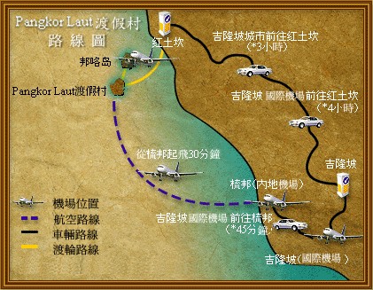 渡假村位於馬來西亞半島西海岸的一個私人島嶼,即Pangkor Laut島上。各國航空幾乎都有國際線班機從世界各主要城市飛往雪邦吉隆坡國際機場(KLIA)。