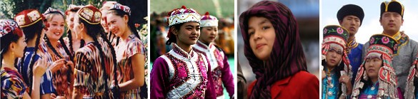 新疆少數民族的傳統服飾色澤艷麗,五彩繽紛,種類繁多。維吾爾族、哈薩克族等少數民族婦女愛穿色彩鮮艷的連衣裙,外套坎肩。維吾爾族、烏孜別克族連衣裙寬大,胸前多褶,而哈薩克族、柯爾克孜族連衣裙下端多皺褶,塔吉克族婦女喜歡在裙子上係圍裙。維吾爾族、烏孜別克族等民族的男子多穿過膝、無領、對襟“袷袢”(長袍),喜歡在腰間係一條腰帶。蒙古族、達斡爾族喜歡穿袍子,腰扎紅、黃、綠彩色緞帶。維吾爾族、哈薩克族、柯爾克孜族、塔吉克族等民族還非常喜歡在衣服的領口、胸前、袖口、肩、褲腳等處用各種彩線繡上精美的花卉花紋圖案,有時綴上彩珠和各色亮片等裝飾品。戴帽幾乎是大多數少數民族的共同愛好,尤其喜歡戴花帽,但又隨民族與地區不同而互有差別,其中維吾爾族男女老少均戴四楞小花帽。