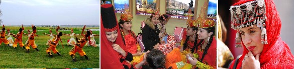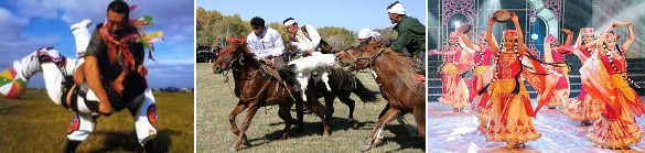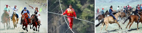 每逢肉孜節和古爾邦節,維吾爾族男性合著納合拉鼓和嗩吶的強烈節奏,要熾烈地跳薩瑪舞。各兄弟民族還有一些自己特有的節日和慶典,如哈薩克族每年在春分時節的“那吾魯孜”節;蒙族每年7 8 月間舉行的“那達慕”大會;錫伯族一年一度的“四 一八”西遷紀念日和農曆正月十六的“抹黑節”;塔吉克人每年春播時要過“播種節”,每年齋月前一個月,還要過兩天“巴羅提節”(燈節);“撒班節”又叫“犁頭節”,是塔塔爾族特有的節日,是專為迎接春耕而舉行的;俄羅斯族有許多的盛大的節日,其中“帕斯喀節”是他們主要的傳統節日(“帕斯喀節”也就是基督教、東正教的“復活節”)。每逢節日慶典時,少數民族有許多的妙趣橫生的娛樂活動,如叼羊、姑娘追、賽馬、摔跤、馬上角力、飛馬拾銀、射箭、高空走繩、對唱、趕巴扎等,使人流連忘返。
