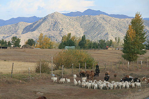 哈薩克牧民秋季轉場的日子,在一條條古牧道上,幾十萬頭牲畜,形成一個個連綿不斷的遷徒團隊,隊伍後騰起的塵煙頗為壯觀。這樣的壯觀場景隨著社會經濟的發展,隨著交通運輸的發展,現已有40%的轉場改為汽車運輸。以後牧人趕著牛羊轉場的壯觀景像,會越來越少了,轉場也即將成為歷史雲煙了。