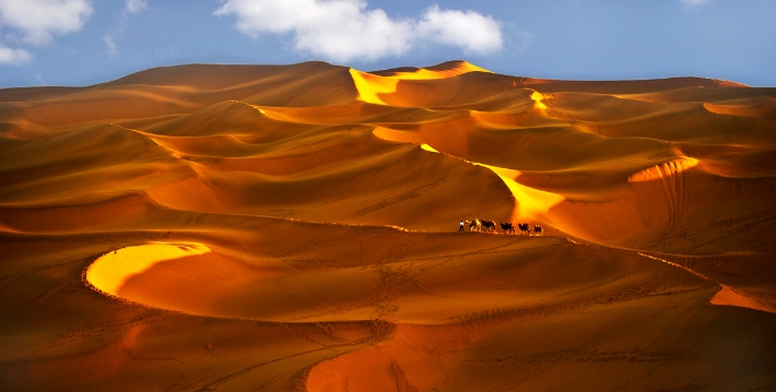 將中國與中亞及歐洲聯結起來的傳奇式的商路絲綢之路沿塔克拉瑪幹沙漠的北緣和西緣延伸。