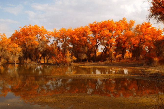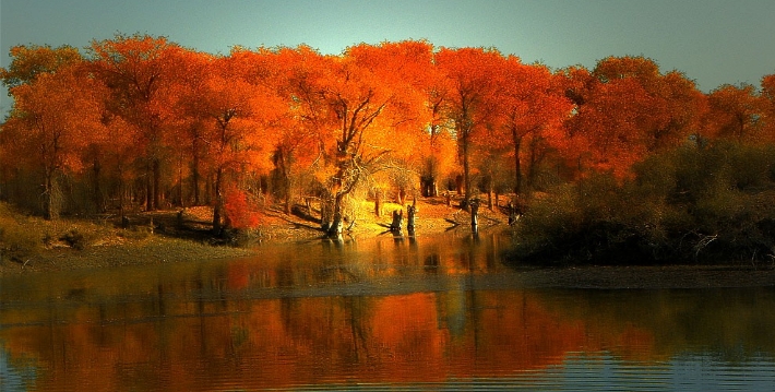 如果將全國各地的胡楊作比較,無論胡楊之美還是胡楊之剛毅都由新疆獲冠。新疆胡楊號稱“生而一千年不死,死而一千年不倒,倒而一千年不腐。”在輪台的塔里木河附近沙漠地區,胡楊林的氣勢、規模均在全國之首,輪台的胡楊林公園也是國內獨一無二的沙生植物胡楊樹林的觀賞公園。當秋色降臨,步入胡楊林,四周為燦爛金黃所包圍。窪地水塘中,藍天白雲下,胡楊的倒影如夢如幻。由輪台往南100公里的沙漠腹地,為大面積原始胡楊林,不少古老的胡楊樹直徑達1米以上。