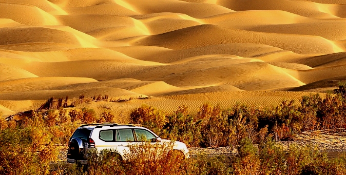 塔克拉瑪干沙漠和撒哈拉沙漠都是聞名世界的流動沙漠,在世界各大沙漠中,塔克拉瑪幹沙漠是最神秘、最具有誘惑力的一個。沙漠中心是典型大陸性氣候,風沙強烈,溫度變化大,全年降水少。變幻多樣的沙漠形態,豐富而抗鹽鹼風沙的沙生植物植被,蒸發量高於降水量的乾旱氣候,以及尚存於沙漠中的湖泊,穿越沙海的綠洲,潛入沙漠的河流,生存於沙漠中的野生動物和飛禽昆蟲等;特別是被深埋于沙海中的絲路遺址、遠古村落、地下石油及多種金屬礦藏都被籠罩在神奇的迷霧之中,有待於人們去探尋。