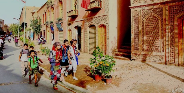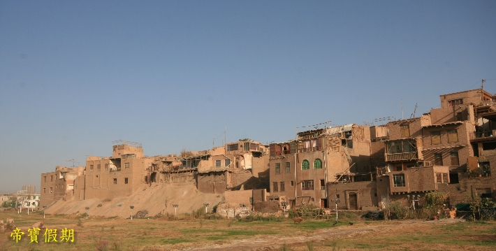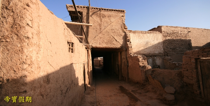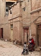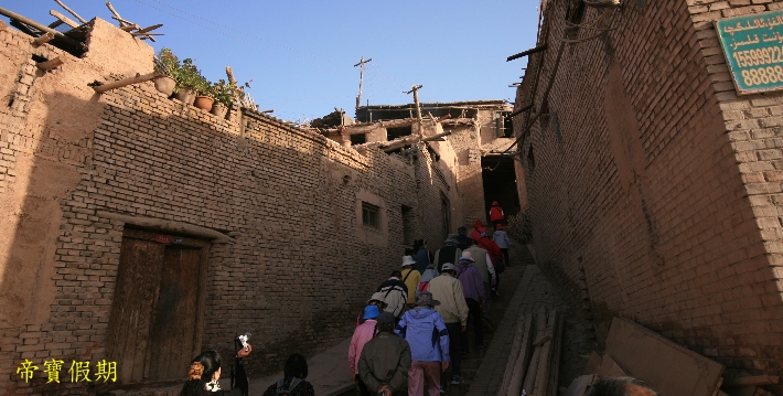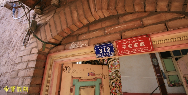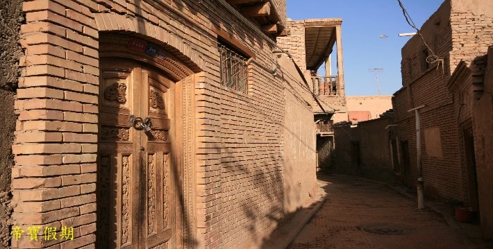 奇特的自然風光、濃鬱的民族風情、燦爛的歷史街區土石路面的巷道,寬一點的能走驢車,窄的兩人並肩難行;街巷長者600多米,短的50米就到盡頭。街巷東轉西折,南彎北錯,迂回曲折,看似路盡,卻柳暗花明又見一巷,恰似《水滸傳》裏祝家莊的盤陀路。巷道兩邊是一戶戶維吾爾民居。民居屋舍很有特點,一般人家都在有限的平面上,蓋起兩到三層土木結構的小樓,有的向下延伸,建成地下室。客廳、居室皆由木質扶梯、樓梯連結。家家都有晾臺,位於平面屋頂。每戶都有不大的庭院,用於養花或置放盆景。盆景、鮮花與建築物廊柱、木雕、挑簷上的各色花飾交相輝映,錯落有致,幽靜清新。有時在兩條巷道的相接處,會遇到跨街架起的一間小樓,似成門廊,使小巷增添丁幾分古樸與幽深。走上一條條越來越窄的小巷,穿過一間間越建越高的屋舍,來到孜裏其巷的一戶維吾爾族家庭。據介紹,這戶住宅建在老街區的最高處。進門後,腳踩木梯,拾級而上,登至屋脊,眼前豁然開朗,真有“一覽眾屋矮”之感。就是遠處林立的高樓,也仿佛只在腳邊。