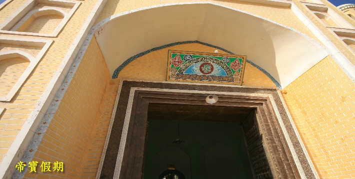 清真寺大門: 用黃磚砌築,白石膏勾縫,看上去線條清晰,非常醒目。正門高12.6米,兩側的塔高近18米,大門高4.7米,寬4.3米。 門前有一個扇形13級臺階,走上臺階便是門廳,銅包的兩扇木門,高大雄偉。 寺門上方的牆頂是一條長8米、距地面10.5米的巨大平臺。每逢盛大節日,平臺上就會傳來通宵達旦響徹雲霄的羊皮鼓和鎖呐樂聲,為雲集于艾提尕廣場的數萬穆斯林製造節日的歡樂氣氛,大規模的“撒滿”群舞盛況空前,為全疆各地所罕有。這裏既是宗教聖地,又是節日喜慶的場所,“艾提尕”——“節日禮拜與集會之所”,因此得名。作為大清真寺入口的寺門塔樓,在造型藝術上位列整個建築之首,堪稱維吾爾族古建築藝術的典範,早已成為喀什噶爾古城的地方象徵而名揚中外。