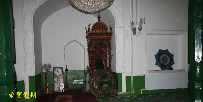 正殿東牆兩側各有一個雙扇大門,供人們出入,正中有一個寬1.8米,高近4米的米合拉普(牆壁上圓拱形圖案),其中兩側各有兩扇窗戶。正殿西牆也有一個米合拉普,高4.3米,寬3.1米。在這裏放有大毛拉講經的坐台.米合拉普北側有五個壁龕,南側有四個。 正殿的南牆和北牆各有兩扇門和一扇窗戶,正殿內共有18根支柱,正殿的南北兩側是外殿,北側外殿西牆有壁龕14個,北牆四個。南側外殿西牆有壁龕11個,南牆有四個,在7和8的中間,有一扇雙開門是清真寺的後門,門內是小院,院內西牆還有一個門,通向外面,後門一般是用來運送屍體的,而且只在週五“居瑪日”時才使用。北側外殿有彩色藻井五個。長3.6米,寬3.2米,南側有四個。正殿前廊藻井有一個,長6.6米,寬5.5米。外殿有立柱122根。柱底、柱身刻畫。柱底尺寸基本上是35至40釐米。正殿前廊柱高5.4米左右,兩側柱高基本是5.1米左右。
