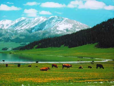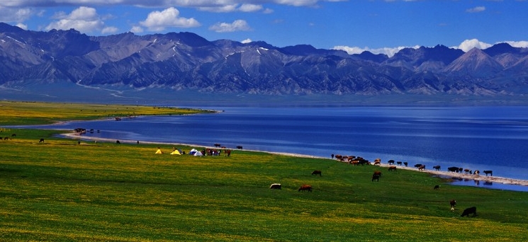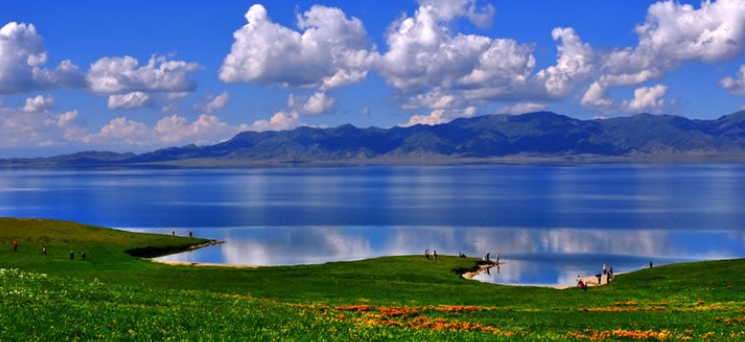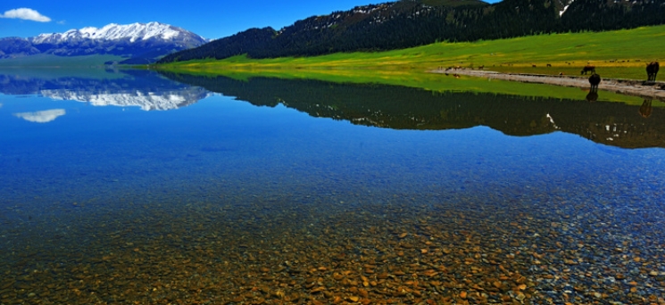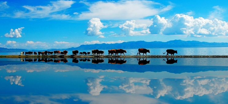翠墨綠,湖濱碧草繁花,氈房星點,馬嘶羊咩,風景如詩如畫。湖周有烏孫墓、岩畫、石刻分布。 賽里木湖長期以來流傳著湖怪、湖心風洞,旋渦與海底磁場等傳說。這裡還有國家級的節慶活動——賽里木湖那達慕大會,每年7月底、8月初,當地的蒙古族和哈薩克族牧民,都要在這裡舉行。那時是您到這裡觀光旅游的好時機。