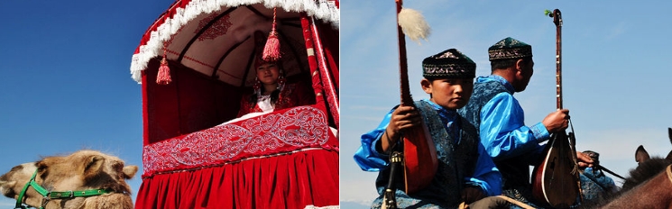 哈薩克族草原婚禮可謂是一路被歌聲包圍的,哈薩克族娶親儀式中要有10個歌手彈唱冬不拉、長琴等樂器。娶親隊伍到達後以新郎為主在氈房外唱“加爾加爾”歌,男方以描述婚後生活的美好。新娘聽到歌聲後,開始唱“哭敘”歌,女方敍說離家的痛苦,隨後男方在女方氈房門前唱勸嫁歌,有女方的嫂子給男方娶親的人員送肉、喜糖、布料等,收到禮物後歌聲停下來,新娘在2個年青媳婦攙扶下從氈房出來抱著氈房門唱“闊爾斯”歌,隨後新娘在親人的陪同下,冬不拉歌手的彈唱下娶親隊伍出發。