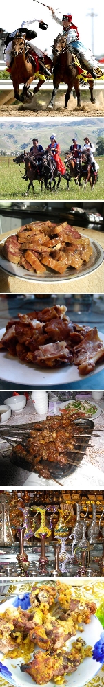 ◆烤全羊和烤肉:烤全羊是最名貴的民族傳統特色佳肴之一,主要用以招待貴賓。烤肉主要是外出狩獵時食用的。