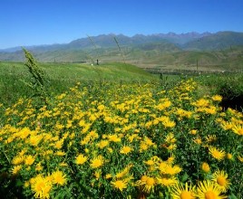 那拉提風景區位於新源縣那拉提鎮鏡內,位於楚魯特山北坡,以那拉提鎮旅遊接待站為核心,包括周圍草原、賽馬場等眾多景點。這裡充滿山村的寧靜與祥和。河谷階地發育明顯,山勢和緩,坡度約11—12度,生長著茂盛的細莖鳶尾群系山地草甸。其它伴生種類主要有糙蘇、假龍膽、苔草、冰草、羊茅、草莓和百裡香等。6—9月,各種野花開遍山崗,紅、黃、藍、紫五顏六色,將草原點綴得絢麗多姿。
