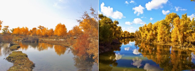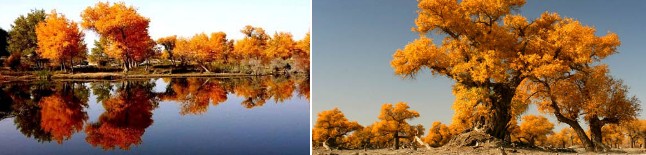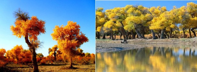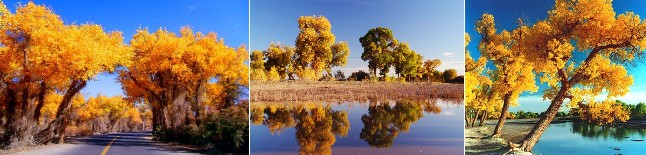 這是鑲嵌在世界第二大流動沙漠塔克拉瑪干懷抱中,令無數探險旅游者心馳神往的一塊神奇綠洲。天高雲淡,風清氣爽的金秋十月,是沙漠森林公園最美的季節。沿途兩岸,整個百萬畝胡楊一片金黃,古林老樹千姿百態。當秋天的陣陣涼意融進夕陽,胡楊就像被豐收的美酒醺醉、潮紅似的,變得興奮妖嬈起來,一夜之間,變得通身金黃。在麗日下遠眺,像一個典雅的公主在迎風翩翩起舞,舞步輕盈得如鴻翎落地,似紫燕凌空,那色彩像幾十萬只清脆的鳥鳴交彙,幾十萬束陽光柔和地飄灑在空中,形成沙漠與天空的交響,色彩和生命的狂歡,悲壯雄渾,溶入心,流入脈,成為驚嘆的旋律,夢幻的驥駿,神馳於神聖仙境的蒼穹,令人愜意,讓人忘憂;清澈的塔里木河面上野鴨和無名水鳥在追逐嬉戲,與林間不知名的鳥鳴聲相映成趣,沿途還有那巧奪天工的沙海金字塔、新月型沙丘、沙鏈;蒼茫無際的大漠日出、長河落日;還有那令人心馳神往、留連忘返的曠野篝火、瀚海駝隊、湖光倩影,伴隨著連綿不絕的悠悠沙鳴,給這片瀚海沙漠中的沙漠森林公園帶來無限生機。