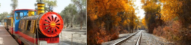 這裡有一條約17公裡長的觀光區域,彎道有126處古老胡楊林道,在秋高氣爽的時節,可沿路欣賞不同形態的胡楊風采。休閑娛樂區則有一條13公裡長的環形游覽小鐵路,將幾個較大的林中湖泊串連在一起,湖邊茂盛的胡楊倒映水中,一片片金黃的倒影分外迷人。乘坐觀光小火車,可以方便地飽覽大漠裡的江南秀色。 塔里木胡楊林公園附近也有不少歷史遺跡,除了感受金色胡楊的堅毅頑強之外,還能體驗到塞外壯闊攝人的雄壯之情。胡楊森林公園位於從輪台到塔里木河大橋路上的中段岔道拐進處。建議一定要攀上24米高的瞭望塔看看。公園附近有木頭賓館、磚砌的四合院接待站和食堂,可解決食宿,公園以外的“民間胡楊”同樣繁茂。