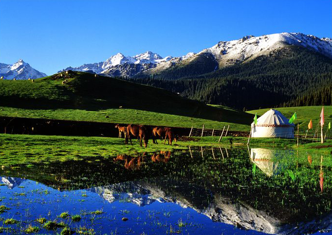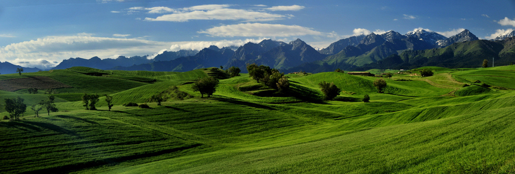 獨特的地理位置賦予了她綺麗多姿的自然風光。這裡冬無嚴寒,夏無酷暑,一草一木,一山一水都寫滿了綠色與美麗,充滿著神奇和誘惑。她燦爛地袒露著美麗的胸膛,安詳地躺在東天山的臂膀之中,顯得那麼清純,那麼寬厚,那麼溫柔,那麼聖潔。