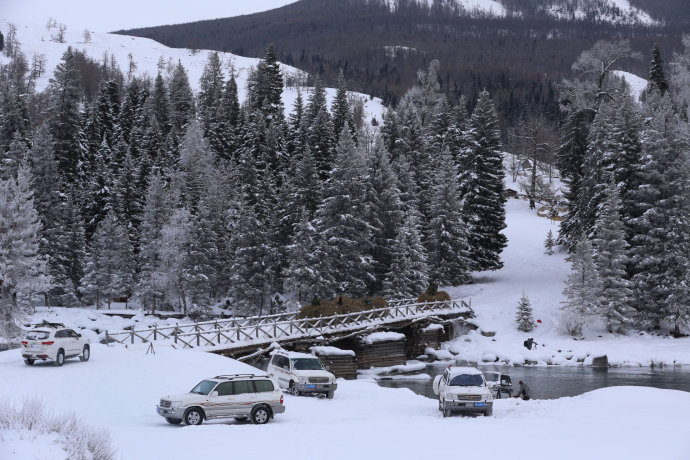 冬季的禾木銀裝素裹,白雪皚皚。棕紅的白樺梢、墨綠的雲杉樹和深黑的西伯利亞落葉松錯落林間,是天然的調色版。