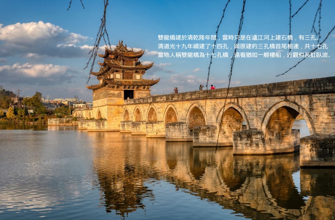 雙龍橋就是俗稱的“十七孔橋” 是雲南省著名古蹟之一,被認為是雲南省規模最大、藝術價值最高的一座多孔連拱橋,已列入中國造橋史冊。