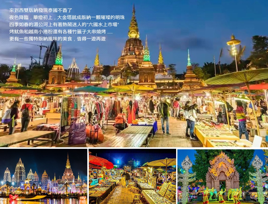 據說 .... 這是亞洲最大的夜市,五光十色的燈光下,讓人感覺到整個世界只剩下美好 喜歡這個地方的原因是 ..... 既飽眼福、又飽口福 傣味燒烤、傣味涼拌、熱帶水果、讓人肚子不夠用 夜晚的大金塔實在太美了,夜市已經成為西雙版納的標誌 如果你還未曾愛上西雙版納 、那一定是因為你還沒在這裡留下足跡