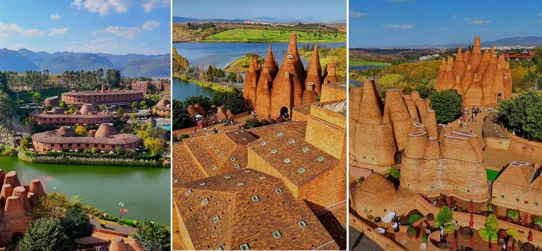 運用了超現實和後現代的建築風格,未用一根鋼筋,一根釘子,僅彌勒本地生產的紅磚就搭建而成。這樣看似無章法的建築,出自一位出生於彌勒的「奇人」之手。從未受過高深教育的羅旭先生,據說他連個設計圖都沒有,就如螞蟻築巢一般開始隨心而動建造起來。以最粗糙的方式搭建將當地三種文化混合其中,酒瓶狀代表的是彌勒的紅酒文化,還有彝族的火文化和共生向上的文化。在