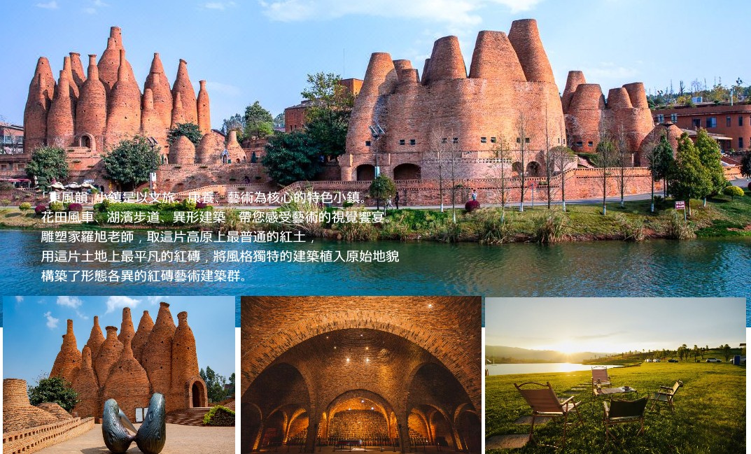 東風韻景區 東風韻藝術小鎮,位於雲南省紅河州彌勒市,它將自然風景、人文旅遊、葡萄文化融為一體,移植打造以文化藝術為主題的旅遊度假地點。 前往【東風韻風景區】古典、童話、獨特的「大印章」房、「酒瓶子」房等令人耳目一新的建築。穹頂依穹壁磚牆紋路開鑿圓形開窗,陽光從建築頂端無遮攔直接打入室內。