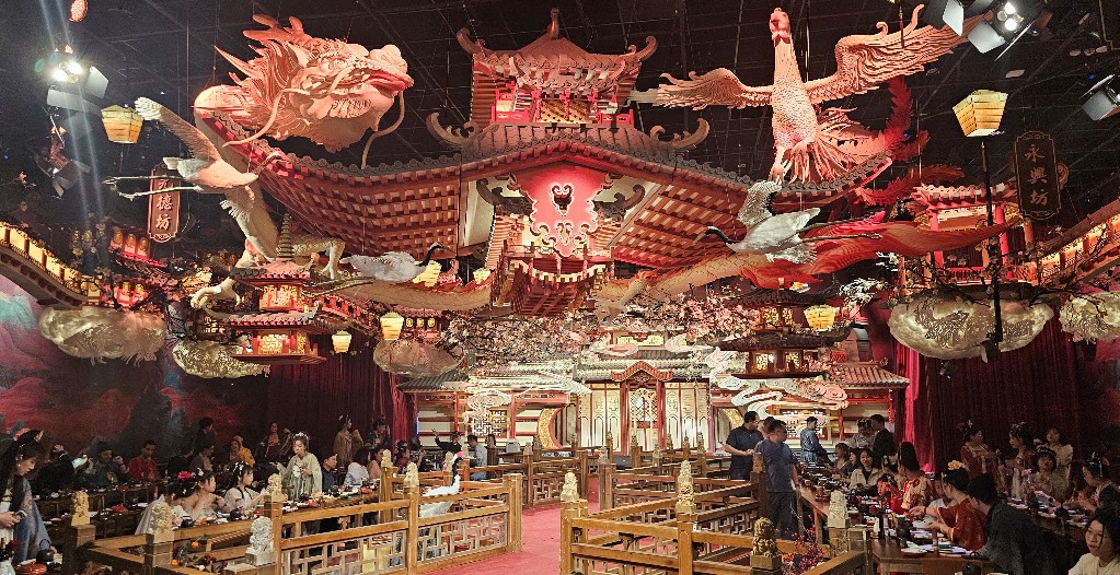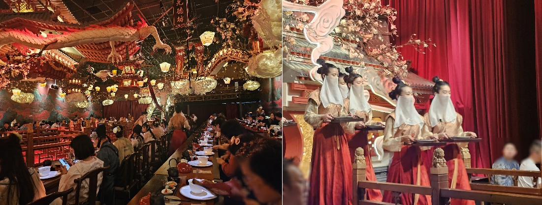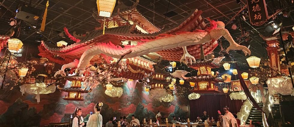 宮廷場景與拍照 從您邁入「敘宴」的那一刻,便彷彿穿越時空,置身於古代盛世之中。 餐廳內部佈置致力於還原古代宮廷風貌,從高懸的宮燈到古色古香的亭台樓閣和舞臺,處處是景,非常適合拍照留念。
