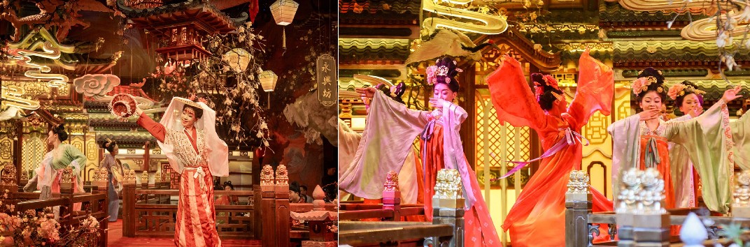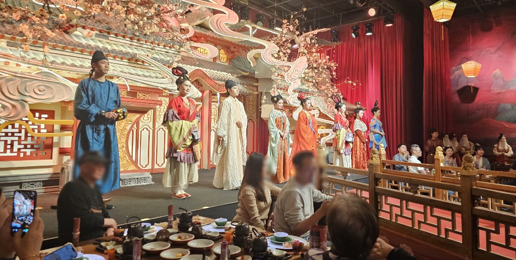 宴席中,每道菜的呈現都會搭配一段精心編排的演出,如舞蹈《鳥歌萬歲樂》、《百戲競天衢》、《飛花醉詩觞》、《長恨歌》、《劍器破陣樂》、《傩祭·祈天和》、《萬邦朝賀曲》等(針對“長安賦”主題)。這些表演旨在還原唐代的宴飲文化和禮樂制度,讓賓客在品嘗美食的同時,欣賞到精彩的藝術表演。