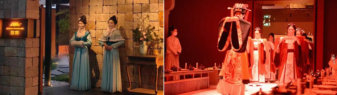沉浸式主題演出 整場晚宴約90分鐘,演出貫穿始終。 您將欣賞到一系列精心編排的節目,內容可能包括祭禮、迎禮、樂禮、舞禮、茶禮、曲禮、慶禮等環節。節目會根據不同季節或主題變換,例如您可能會遇到以唐朝為主題的演出,欣賞到如《長恨歌》、《牡丹亭・遊園驚夢》、《霓裳羽衣》等經典曲目的演繹 。