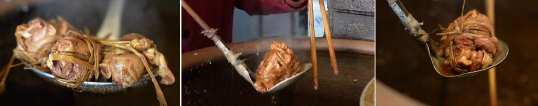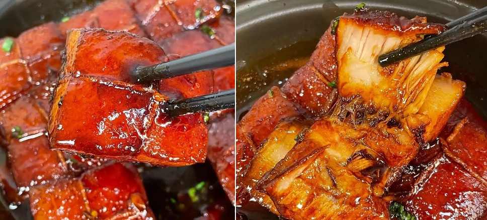 東坡肉 東坡肉以五花肉慢燉而成,肥而不膩,色澤紅亮。相傳北宋蘇東坡在杭州任官時創製,佐以薑、蔥、料酒等調味料,肉質酥爛後盛於紫砂盅。此菜款多次入選國宴,成為江南宴席經典。