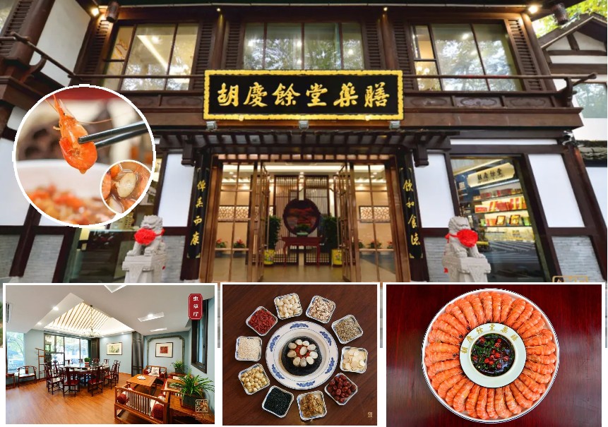 胡慶餘堂藥膳 藥膳館的菜色由胡慶餘堂名醫館近300位老中醫親傳秘方,醫師、藥師、廚師「三師合一」共創菜系。例如根據國醫大師的養生理念研發的“十全大補湯”,選用道地藥材搭配時令食材,經過12小時文火慢燉;還有老中醫們改良的“杭幫菜”,在傳統東坡肉中融入茯苓、枸杞等藥材,既保留醇香口感,又達到“寓食於醫”的效果。
