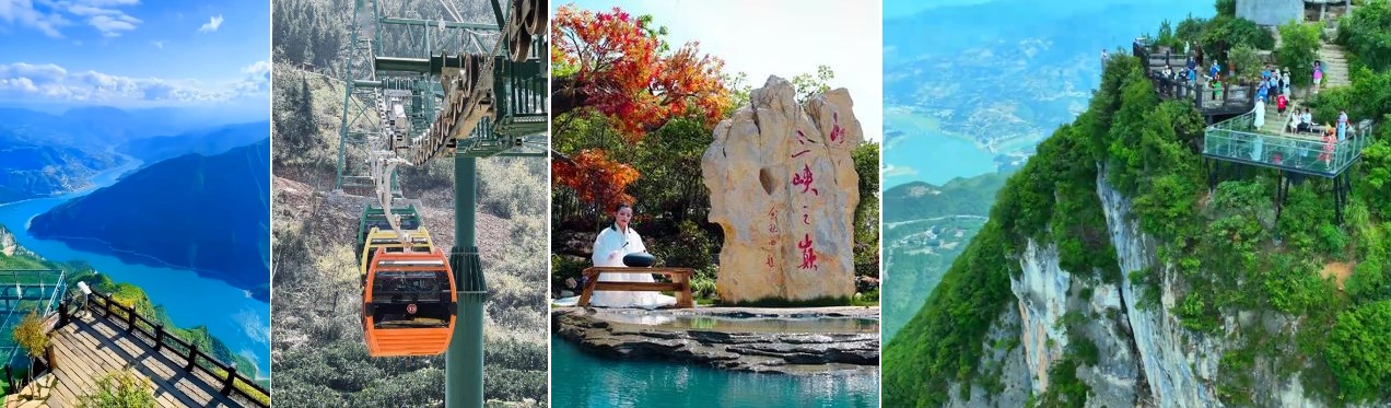 行程B: 13:30-17:00 上岸遊覽三峽之巔 三峽之巔,以上帝視角俯瞰瞿塘峽的峽穀風光;看瞿塘峽驚危甚,看夔門雄渾天下,看滾滾長江東去。 景區位於赤甲山頂,夔門之上,景區北起工坊槽,南眺白鹽山,西望白帝詩城,東臨巫山機場,綿延10餘公里。 三峽之巔峰區因杜甫《夔州歌十絕句》「赤甲白鹽俱刺天,閩閻繚繞繞接山巔」的詩句而得名,於2020年5月1日成功開園,2020年10月被評為國家AAAA級旅遊景區。