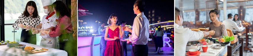 每日不同的飲食 世紀的星廚團隊,每天推出一種精心烹製的主題風味美食,比如川渝麻辣風味、廣式粵菜風味、江南淮揚風味、荊楚魚米風味等等中國珍饈;不僅如此,從登船之夜起,即為賓客貼心準備了遊輪國際自助晚餐,以豐盛的美食為您開啟長江之旅。