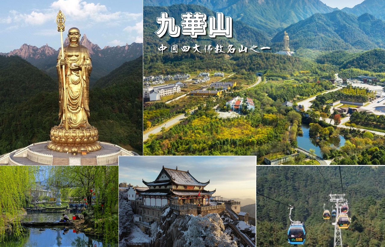 九華山 以地藏菩薩道場馳名天下,享譽海內外。是佛教文化和自然與人文勝景為特色的山嶽型國家級風景名勝區,中國佛教四大名山之一。九華山天開神奇,清麗脫俗,是大自然造化的精品,有“蓮花佛國”之稱。境內群峰競秀,怪石林立,九大主峰如九朵蓮花,千姿百態,各具神韻。連綿山峰形成的天然睡佛,成為自然景觀與佛教文化有機融合的典範。景區處處清溪幽潭、飛瀑流泉,構成了一幅幅清新自然的山水畫卷。還有雲海、日出、霧淞、佛光等自然奇觀,氣象萬千美不勝收,素有“秀甲江南”之譽。