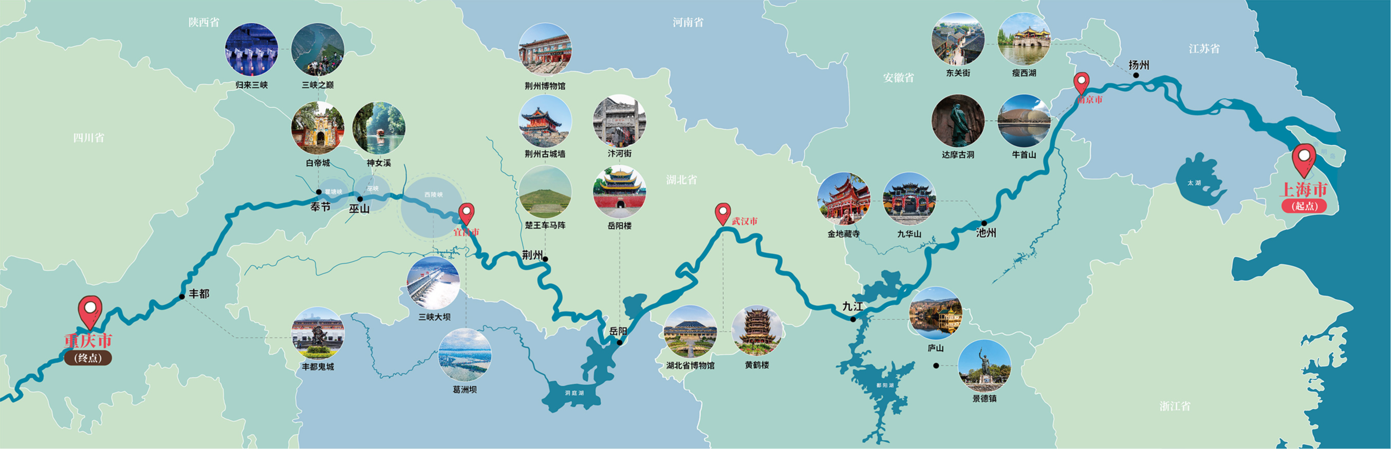 上海 - 揚州 - 南京 - 池州 - 九江 - 武漢 - 岳陽 - 荊州 - 宜昌 - 奉節 - 豐都 - 重慶