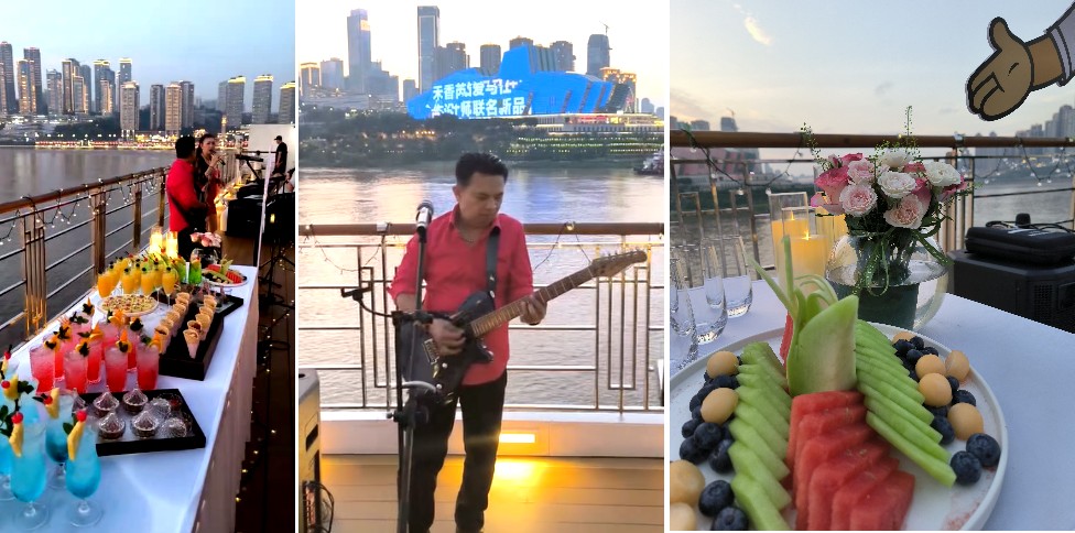 登船囉 ~ 在盛大的歡迎儀式下,每一位貴賓們在嘹亮的歌聲中被眾星捧月般的邀請上船,並獻上點心香檳。 在歡迎儀式的鑼鼓聲中,祥獅獻瑞的演出為每一位貴賓致上最深的祝福。 今晚遊輪上為每一位貴賓準備了豐盛的晚餐,夜色下的江景也成為今天餐桌的一部分。 入夜,伴著汽笛長鳴,遊輪啟航。錯落在兩江四岸的大橋、吊腳樓、車流、高樓、 燈光,共同組成了重慶魔幻的 夜景。 啟航後將舉行船長歡迎酒會,船長與全體遊客舉杯共飲,開啟萬裡長江的航行。