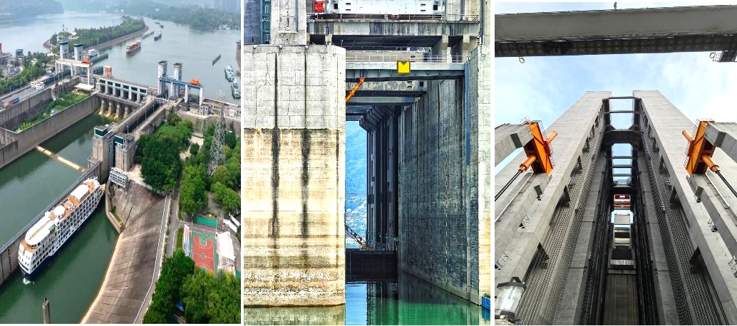 這是世界上規模最大、技術難度最高的升船機,單次提升總重量可達1.55萬噸,垂直升降最大高度113米,相當於40層樓高。