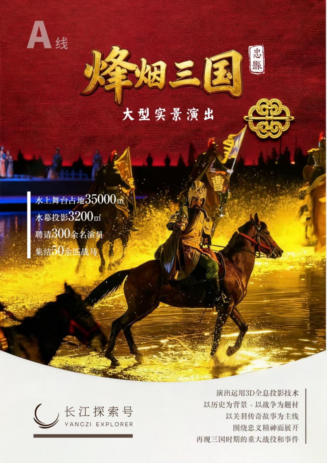 A線:烽煙三國大型實景演出 三國演義,實景再現。新版大型實景演藝《烽煙三國》於本月22日在忠縣三峽港灣震撼上演,霸氣歸來。 斥钜資打造的大型實景演藝《烽煙三國》根據中國名著《三國演義》改編創作,作品以忠義之神關羽為主線,通過“桃園結義”、 下邳之戰”、“身陷曹營”、 “單刀赴會”、“火燒赤壁”、“過關斬將”、“水淹七軍”、“忠義千秋”八個章節來演繹三國時代關羽不平凡的一生。