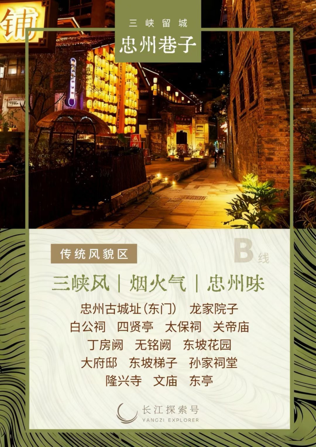 B線:三峽留城——忠州巷子漫步 三峽大壩的建設,讓綿延數百公里的長江沿岸城鎮淹沒在碧波之下,而忠縣成為了其中的幸運兒,雖然舊城有部分也被浸入江水,但仍留住了巴渝鄉愁和原始的三峽風情。針對『忠州巷子』的保護性開發,靜謐的城牆、盤踞的老樹根、斑駁的磚瓦,以及老人們生活中不可缺少的老店都被完好地保留下來。與此同時也在其中因地制宜地發展了新的文創業態。