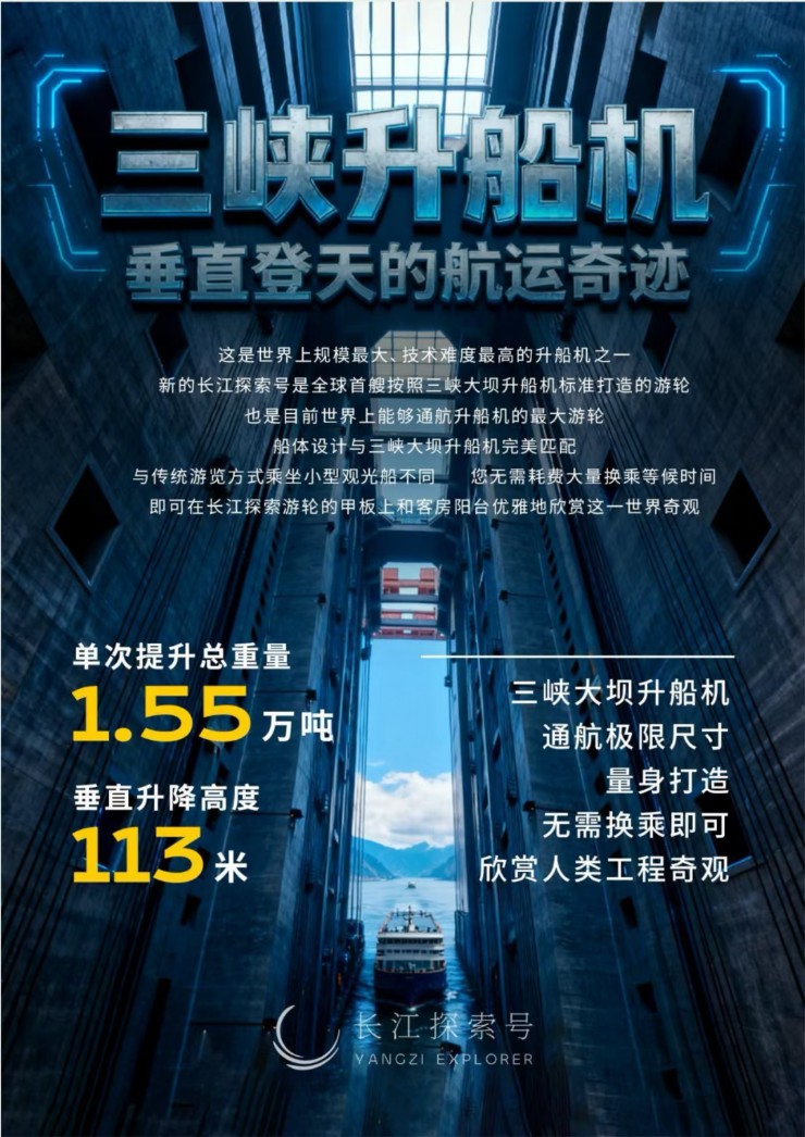 作爲全球首艘依據三峽大壩升船機標準打造的遊輪,您將無需換乘,親身體驗“乘船電梯”穿越大壩的震撼時刻。