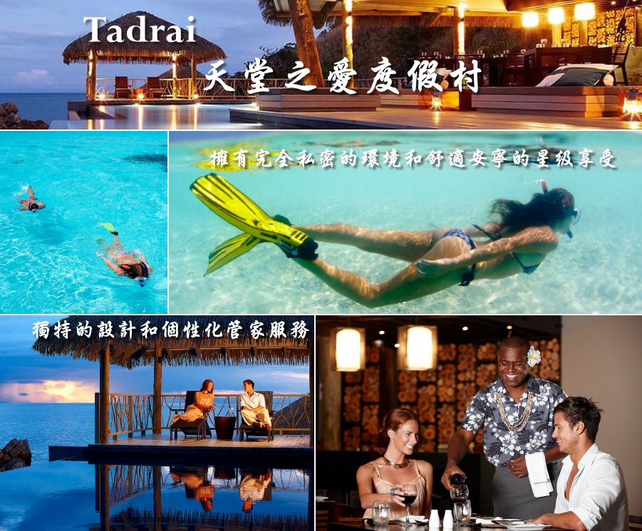 Laucala頂級6日∣超值斐濟6日遊∣歡樂跳島帆船6日∣歡樂瑪納島6天跳島遊∣天堂之愛蜜月6日∣貝卡環礁蜜月休閒6日∣ Laucala頂級8日∣超值斐濟8日遊∣歡樂跳島帆船8日∣歡樂瑪納島8天跳島遊∣天堂之愛8日蜜月∣貝卡環礁蜜月休閒8日∣ 假村蜜月8日之旅 天堂之愛渡假村簡介: 帝寶假期為您推薦斐濟最新的頂級度假村,整個度假村僅有5間豪華別墅,這裡必須要18歲以上的貴賓方可入住。斐濟風格的豪華別墅搭配著超現代的內部裝飾 ,包括戶外淋浴和私人泳池的設計,都為客人營造極致浪漫的庇護所。客人可以在娜瓦圖搖滾泳池餐廳中品嘗到太平洋沿岸地區的美食,也可在房內享受私人廚師用餐。 這裡是為情侶們提供了遠離喧囂,屬於自己的安寧平靜的私人天堂。處在熱帶棕櫚樹叢享受著傳統的茅草屋式的別墅,以絕美的南太平洋海灣日落作為背景的美麗世界 ,這是何等的人間天堂!