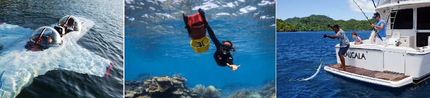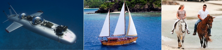 從騎馬到搭乘4×4越野車遊島外,衝浪板、帆船板、潜水、水上摩托、帆船,甚至還有深海的潛艇遊,真正的帶您到150米深的海底的潜水...。