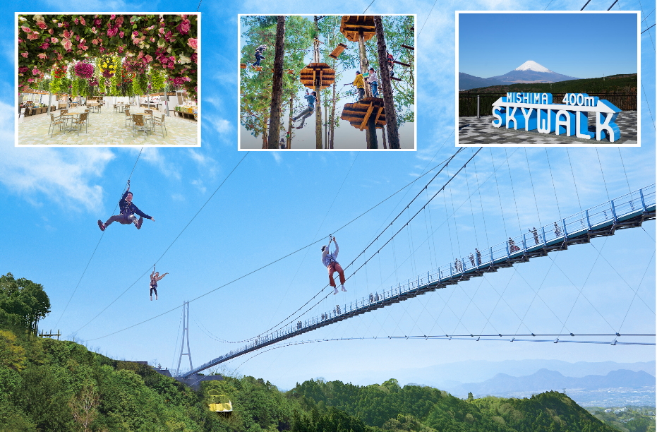 吊橋西側的風景堪稱絕佳,可將富士山和駿河灣盡收眼底。 南邊的區域內可同時觀賞橋與富士山的眺望區,還有長滿美麗鮮花的室內庭院。 在這裡還可以找到三島的當地美食Mishima可樂餅。 吊橋的北邊有一個公園,裡面有著各種活動設施,如叢林飛翔(Zip-line)或森林探險等。