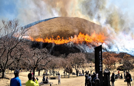 山燒據說有700年的歷史。 最初是為了促進生活用優質茅草的生長和消滅害蟲而進行的。 為了滿足對以多種方式使用的茅草的需求,在村莊附近的田野和山區建立了稱為茅草田的牧場。大室山就是這些乾草田之一。不過,就算是草地,如果疏忽打理,雜樹雜草也會很快長得很粗。因此,為了長出優質的新茅草,每年地上的草都會被燒光,只剩下茅草的根。 燒山是防止茅草以外的植物發芽最簡單的方法。這樣,它促進了新茅草的發芽。換句話說,山燒作為保護茅草的農業活動而流傳下來。