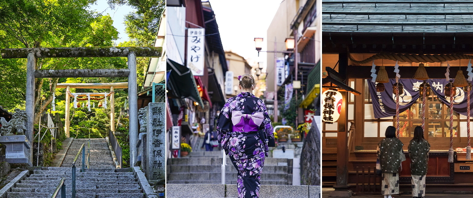 石階梯古街道 古街中央的階梯都是由石頭堆砌而成,層層疊上長約300公尺、共有360個階梯。 石階的周邊林立小型商店、餐廳和傳統旅館,呈現舒適愜意的氛圍。 除溫泉浴池外,伊香保的景點還包括神社、博物館及商店出售的溫泉饅頭(一種內有紅豆餡的日式點心),據稱就是起源於此町。 整條街道仍然瀰漫著日本昭和30、40年代的復古氣氛,石階中央整排歐風路燈,更是襯托出伊香保獨特的風格;石段街兩端排列各具特色的精品店及小吃店,泡湯遊客穿著浴衣沿著石階閒逛,形成一種傳統而典型的日本印象。 伊香保御關所(醫藥神社) 伊香保神社的歷史可追溯至 825 年。這裡供奉著溫泉之神與醫藥之神,突顯當地對於具有療效溫泉的重視程度。當地人認為走完 365 級石階登上伊香保神社,將帶來好運和財富。鎮上的商店與咖啡廳沿石階而建,讓旅客在途中方便尋找歇腳處。 走上石階之後便會見到美麗的神社,可在此將伊香保的風光盡收眼底。
