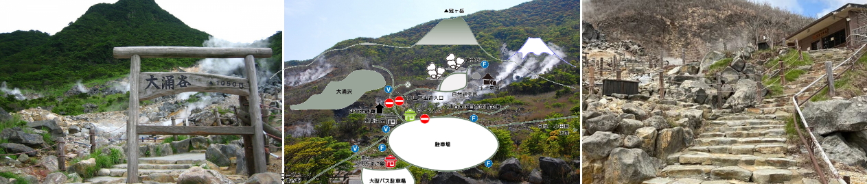 大涌谷 是三千多年前因火山大噴發而形成的火山口遺跡,也是箱根溫泉的一大源頭。在這裡可以欣賞到硫磺蒸氣和溫泉,還可以品嚐到用溫泉水煮的“黑玉子”(即黑雞蛋)。因為硫磺含量過高,這裡的溫泉並不能直接泡。 跟隨指示牌,沿著大涌谷散步道往山里走,會看到延命地藏尊,這有一個地藏菩薩雕刻,可以洗手祈福。繼續向前走15分鐘左右,到了白煙裊裊的噴煙地(即閻魔台),能近距離觀看大涌谷的山岩和岩縫間噴出的熱蒸氣,還能看到用溫泉煮雞蛋的過程。 在黑玉子館附近的紀念品商店裡可以買到黑玉子及大涌谷特色點心、黑玉子工藝品、箱根寄木細工、大涌谷化妝品等商品,比較特別的是這裡的Hello Kitty黑玉子,是打扮成黑雞蛋造型的凱蒂貓玩具。大涌谷還有一條通往姥子溫泉、桃源台方向(蘆之湖旁)約1公里長的下山路,如果計劃前往且時間充裕的話,不妨沿著此路散散步。