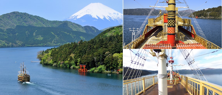 箱根蘆之湖海盜船 面積 6.9平方公里,湖深 40 公尺,環湖長度為 17.5 公里,標高723.5公尺,是於四千多年前因火山活動而形成的火山湖,春天湖畔有櫻花盛開,秋天滿山遍野楓紅片片,可由南岸的杉木街道眺望富士山,湖光山色有如風景畫,搭乘仿十 七世紀歐洲戰艦造型的海盜船。馳航於風光明媚的蘆之湖湖上,湖光山色盡收眼簾。在甲板上可以看到蘆之湖邊風光旖旎、人跡未至的森林和點綴於岸邊的沿湖箱根神社入口處巨大的紅色牌坊(鳥居)。蘆之湖四周群山環抱,山上林木蓊翠,湖畔綠草如茵,湖水碧澄清澈,湖面輕煙瀰濛,這座名湖以反映富士山及箱根神社之倒影而聞名,配以湖畔 的樹木園,相得益彰。