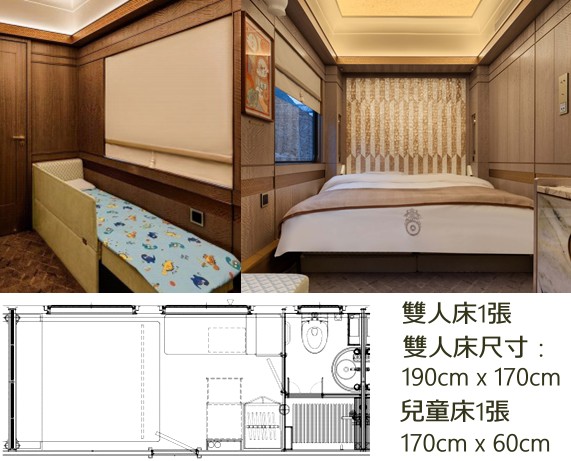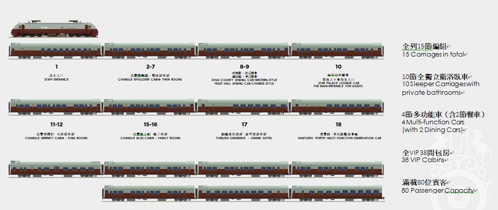 列車編組:15節 | 衛浴臥車:10節 | 多功能車:4節 | 房間數量:38間 |