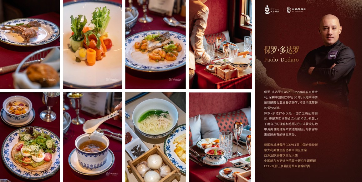 這場絲路長宴以精緻的七道式菜單,全面打開食客味蕾 由八個小盞點心開啓 呈現絲路起點至中亞的風物 接着一道道精美的 前菜、湯類、主菜、主食和甜品 從餐食的造型與味道 ... 全方位還原絲路之美 讓賓客還未抵達敦煌 就已在列車上品味到 來自這片土地的風韻