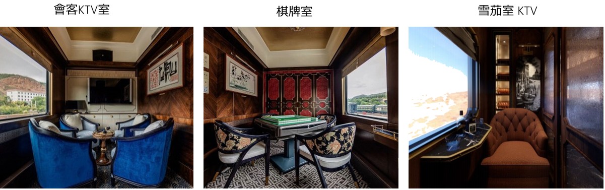 270。超大觀景窗,打破列車與自然 的界限,賓客能在傾瀉而下的晨光與暮色四合的傍晚中肆意捕捉沿途風景 的百變姿態 牆面通過木雕刻及內部燈光的設計, 再現漢都長安古城市井的繁華景象, 展現出燈火璀璨的效果,再現古絲綢之路的地圖和城市風貌,區間可靈活使用隔斷隔出4人會客室,盡享私密空間。 車廂既有共享天地的遼闊,又帶有私密空間的靜謐。 多功能車廂裏有KTV包房,以及國粹麻將包房 。