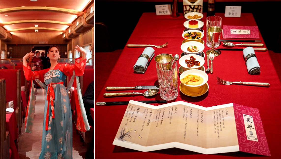 “絲路夢享號” 特別爲賓客準備了“漢宮夜宴” 讓大家能在列車上就感受漢代美學的獨特風情