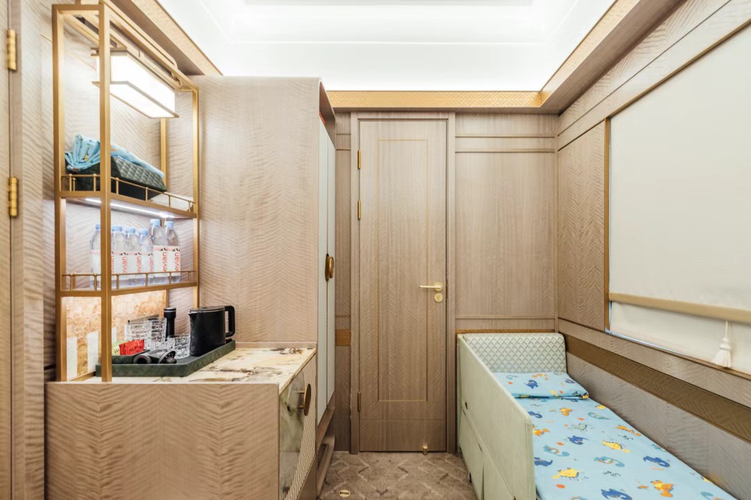 長樂親子軒/親子房 所在車廂:15-16 房間數量:8間 房間面積:11㎡ 衛浴面積:2.5㎡ 牀鋪大小:大牀1.7米*1.9米,小牀0.6米*1.7米 特別解說:牀鋪白天是沙發,晚上才會鋪成牀鋪。