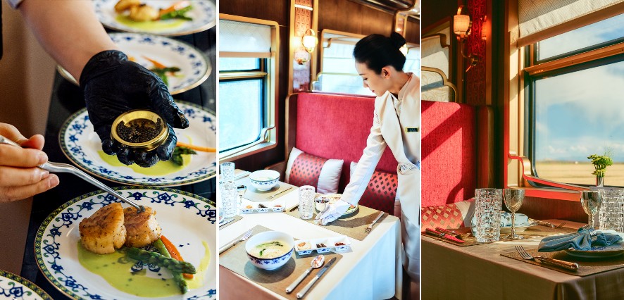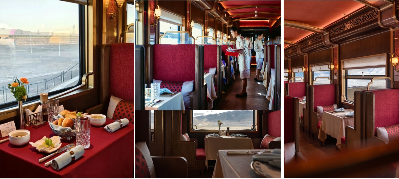 車廂內舒適寬敞,可一邊品味精緻餐點,一邊透過大窗欣賞沿途美景,體驗奇妙而詩意的高原鐵道旅程。