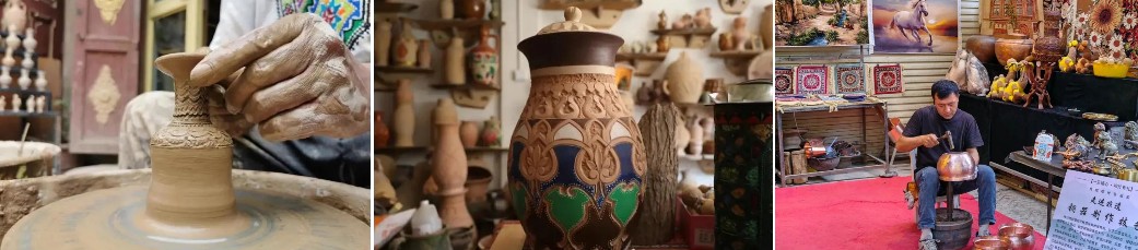 門巴札 庫車市熱斯坦街門巴札巷是庫車明清老城區的所在地,以前因工匠匯聚在此製作銷售門窗,故被稱為「門巴札」。走進“門巴扎”,胡楊根雕工作室、民間編制技藝坊、老物件展廳、彩繪葫蘆坊、木工坊、鐵匠鋪……特色非遺工坊一個挨著一個。